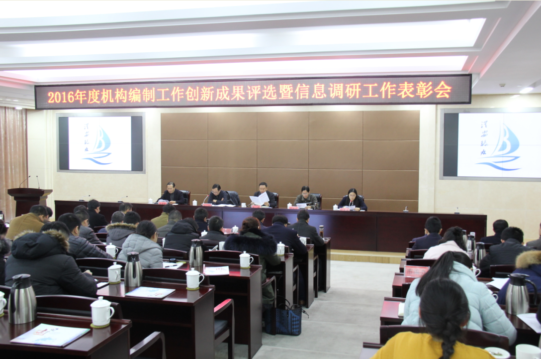 1月20日下午,市编办召开2016年度机构编制工作创新成果评选暨信息调研工作表彰会。市县区编办全体人员参加会议。
